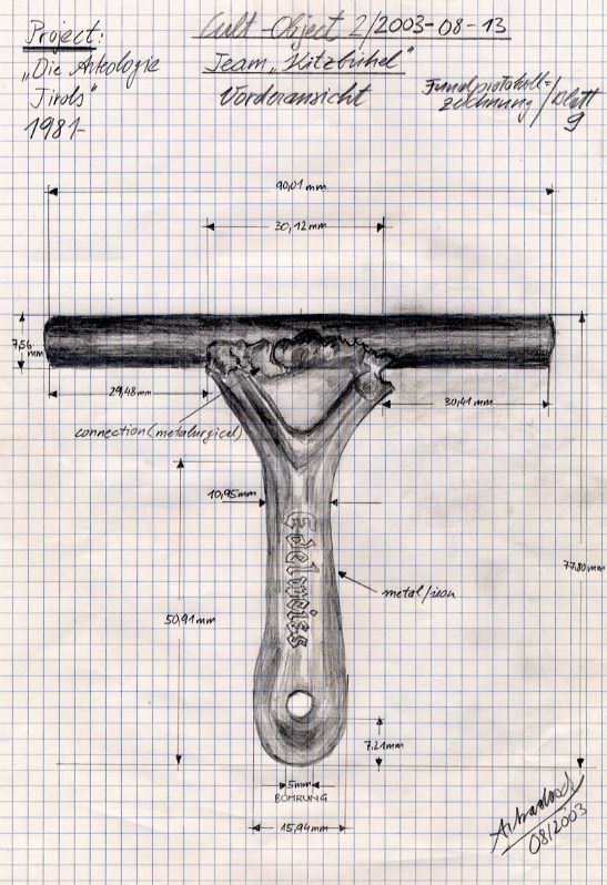 Ad 2: Beschreibung von Cult-Object 2. Sowohl Cult-Object 1 und 2 bestehen zur Gänze aus Metall und wurden im Griffstück aus einem einzigen flachen Metallstück herausgearbeitet. Am oberen, sich in Form eines „V“ ausspreizenden Teil ist eine metallene, runde Querstrebe mit einer Gesamtlänge von 90,01 mm, mit einem Durchmesser von 7,86 mm in geschmiedeter Schweisstechnik angebracht. Der – von der mit schriftartigen Symbolen verzierten Vorderansicht aus betrachtet – linke „Arm“ dieser Verstrebung misst 29, 48 mm und der rechte 30, 42 mm. Die Gesamtlänge von 77,80 mm setzt sich aus dem Griffstück und dem Querschnitt der runden Metallstrebe zusammen. Die metallurgische Verbindung wurde über eine Länge von 30,12 mm in Form einer wulstigen, tropfenbildenden Naht ausgeführt und geht in die „V“-förmige Gestaltung des oberen Teils des Griffstücks über. Dabei wurde das Mittelstück dieses „Vs“ ungeschränkt als Flachmetall ausgearbeitet, was zum einen zu grösserer Stabilität bei gleichzeitig geringem Materialaufwand führte und zum anderen den ästhetischen Traditionen der bisher gefundenen Cult-Objecte entspricht. Die untere Spitze des „Vs“ endet bei 50,91 mm, gemessen ab Beginn des Griffstücks, und weist hier eine Taillierung auf, die eine Breite von 10,95 mm misst. 7,21 mm vom Ende des Griffstücks aus gemessen, findet sich eine mittige Bohrung von 5,0 mm, während der Durchmesser dieses als Rundung ausgebildeten Griffendes insgesamt 15,94 mm beträgt. Beide Cult-Objecte weisen eine Gesamthöhe von durchschnittlich 5 mm auf und sind längsgerichtet ungebogen. Sämtliche Kanten wurden entgrätet und abgespant. Zudem zeigen beide Cult–Objecte auf ihrer Vorderseite symbolhafte, schriftzeichenartige Verzierungen, die in ihrer Gestaltung den bisherigen Funden dergestalt gleichen, dass hier von einer bewussten und kultischen Tradition ausgegangen werden kann. Diese Verzierungen erfolgten mittels Ritzungen und einer nachfolgenden Vertiefung durch die Verwendung eines Säurebades mit Essigsäure (vgl. Laboranlyse vom 16. August 1985, Arteologische Zentralstelle Innsbruck, Ausgrabungsprotokoll 16, Grabung Stubaital 1985). Bei beiden Ritzungen handelt es sich um eine ca. 28 mm lange Zeichenreihe, die aus neun Symbolen besteht. Von oben nach unten betrachtet, wiederholt sich dabei Symbol Nummer drei an der sechsten Stelle. Gleichfalls ident sind dabei die beiden letzten Schlusssymbole. Die Leserichtung von oben nach unten erscheint auf Grund der kapitälchenhaften Form des obersten Symbols als schlüssig. Symbol zwei und vier weisen in ihrer Höhe von 6,50 mm das gleiche Mass vor wie Symbol eins. Die Formensprache zeigt dabei keinerlei Entwicklung zu den bisherigen Funden von Cult-Objecten, sondern bleibt in ihrer kantig wirkenden, balkenartigen Formensprache im traditionellen Gepräge des Kultischen verhaftet.