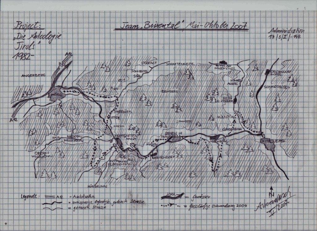 Die fussläufige Voraberkundung des Brixentales erfolgte im Rahmen einer Auslandsexkursion des Arteologischen Instituts der Freien Universität Izmir und konnte aufgrund der bisherigen, sieben vorangegangenen Expeditionen in den Raum Nordtirol auf zahlreiche Forschungsergebnisse und Erfahrungen zurückgreifen, die insgesamt diesen Vorarbeiten ein ungemein breites und auch vielgestaltiges Betätigungsfeld eröffneten. Neben den bereits erwähnten sprachlich-etymologischen Beforschungen wurde speziell auf eine komparative Gesamtschau aller arteologischen Fakten besondere Rücksicht gelegt und dies bereits im Vorfeld organisatorisch berücksichtigt. So konnten neben den rein geografischen und geologischen Auswertungen auch archäologische und historische Daten in die Grundlagenerstellung mit einfliessen und so das Gesamtbild dieser Talschaft schon im Vorfeld entsprechend theoretisch aufgearbeitet werden. Dennoch ergibt gerade eine detaillierte Erkundung vor Ort einen ungemein erweiterten Zugang zu speziellen lokal verortbaren Faktizitäten, die einerseits anhand analytischer Untersuchungen in den Ergebnissen der Feldforschung ihren Niederschlag finden, andererseits aber in weiterer Folge zu genau jenen Fragestellungen führen, die letztendlich die spezifischen Kausalitäten jeder arteologischen Arbeit in sich begründen.