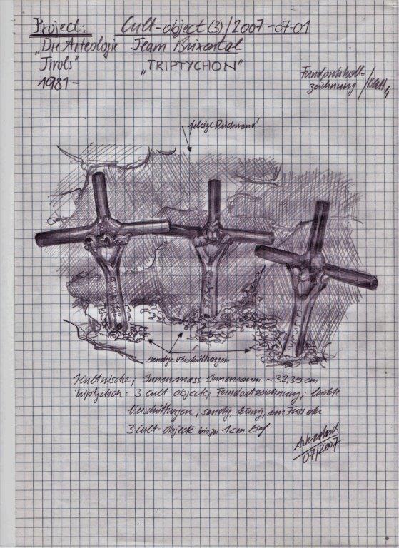 Der Triptychon aus drei metallenen Cult-objecten stellt formal ein gleichschenkeliges Dreieck mit einer Seitenlänge von 14,56 cm dar, gemessen jeweils von der am weitesten nach aussen ragenden Spitze der Querbalken der beiden links und rechts vom mittig stehen Cult-object platzierten Cult-objecte. Diese Querbalken treffen sich in ihrer gedachten Verlängerung im Schnittpunkt der Längs- und Querachse des mittig, am Scheitelpunkt des Dreiecks, angeordneten Cult-objects.