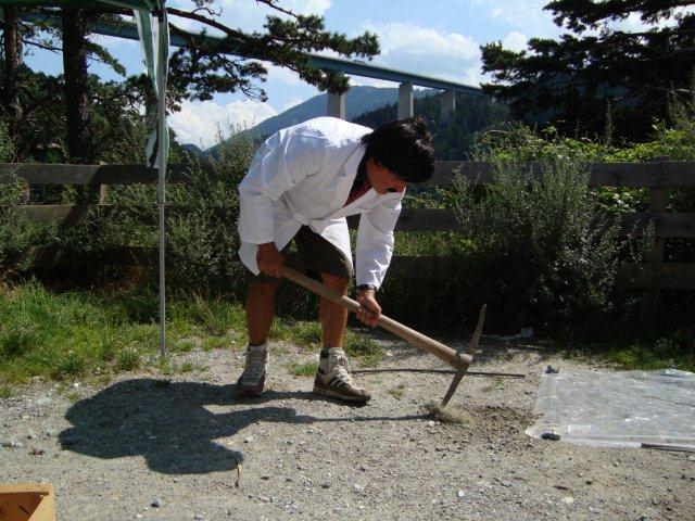 Grabungstechnisch wurden die Sondierungen zuerst auf die oberste, strassenseitig gelegene und relativ ebene Terrasse konzentriert. Durch die Starkregengüsse und die damit einhergehenden Verschlammungen durch wassergebundene Feinstäube, Kiesel und Trassierungsmaterialien (überwiegend grobschotterige Dolomite), verbunden mit der Auftrocknung und Austrocknung der letzten Tage, zeigte sich nahezu die vollständige Terassenfläche unter feinkrustigen Trockenschwemmungen, welche vom Grabungsaufwand her äusserste Sorgfalt und Umsicht erforderten, die nicht nur an das Material die höchsten Anforderungen stellten, sondern auch an die Feinfühligkeit und Geduld der Grabungskräfte. Es musste auf jedes schwerere Gerät (sprich Meisel und Vorschlaghämmer) verzichtet werden, um etwaige Fundstrukturen (die ohnehin durch das Regenwetter in Mitleidenschaft gezogen worden waren) nicht zusätzlich zu verletzen oder gar zu zerstören. Somit waren die Spitzhacke und die Schaufel die Werkzeuge dieser ersten Stunden und Tage, bis tatsächlich unter der feinkrustigen Trockenschwemmung an leichter zu bearbeitende und abzutragende Bodenschichtungen herangegangen werden konnte. Eine an sich schon kräftezehrende und schweisstreibende Tätigkeit welche durch die starke Hitze eines dauerhaften meteorologischen Hochs zusätzlich erschwert wurde und sowohl von Leitung als auch Mannschaft ein gerüttelt Mass an Motivation erforderte. Dr. Arkadasch scheute sich daher bewusst nicht, selbst an den heissesten Stunden des Tages mit Hand an zulegen und eingehüllt in Staub und Schweiss für sämtliche an der Grabung beteiligten Kräfte als Vorbild zu wirken. Nur wer selbst weiss, was zu leisten ist, kann einen derartigen Einsatz auch von seinen Mitarbeitern nachhaltig einfordern.