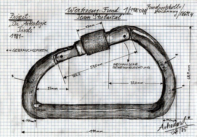 Der gesamte Urkarabiner weist eine basale Länge von 111 mm auf (gemessen jeweils von den Aussenkanten der Rundungen) und verjüngt sich sowohl rechts als auch links in einer (geschmiedeten?) Rundung verjüngend nach innen, wobei die rechte Rundung (sh. Fundprotokollzeichnung Blatt 4, Werkzeug-Fund 1, Team „Stubaital“) nach ihrer Einbiegung mit einem inneren Radius von 35,8 mm ihren Scheitelpunkt in einem Abstand von 68,9 mm von der Grundlänge aus erzielt. In der Biegung weist das gerundete Metallstück zahlreiche feinziselierte Gebrauchsspuren auf, welche sich als klar erkennbare Kratzer von der Innenseite des Materials aus nach aussen ziehend darstellen.