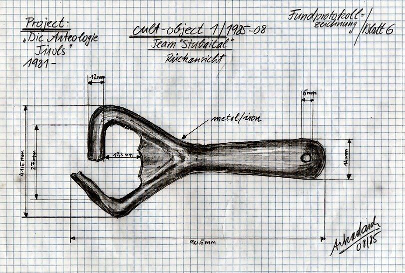 Die am 5. August 1985 in direkter Nähe der basalen Strassenbefestigung entdeckten metallenen Objekte sind eindeutig den gleichgearteten Cult-objekten aus den beiden bisherigen Grabungen im Inntal und im Wipptal sowohl zeitlich als auch verwendungstechnisch zuordenbar. Die Verbreitung dieser Gegenstände über ein unmittelbar häusliches oder kleindörfliches Umfeld hinaus belegt eine allgemeine Wertigkeit dieser Artefakte, die schon auf Grund ihrer Gestaltung keinerlei Eignung für die Bedürfnisse einer täglichen Lebensführung aufweisen (vgl. hiezu den Werkzeugfund „Urkarabiner“ mit seinen vielgestaltigen Verwendungsmöglichkeiten der Arbeitserleichterung bis hin zu Sicherungen von Tieren und Personen im alpinen Lebensraum; Ausgrabungsprotokoll 14 und 14/2, Stubaital). Zwar wurde weder an der Fundstelle „Wipptal“ noch hier an der Fundstelle „Stubaital“ das artefaktionelle Gegenstück „Cult-object 2 – Objekt 4“ (sh. Inntal, Ausgrabungsprotokoll 11, Fund vom 12. August 1982) vorgefunden, jedoch erscheint die gemeinsame Kategorisierung dennoch zwingend, wie die an den gleichen Stellen der Cult-objekte auftretenden Gebrauchsspuren zwingend nahelegen.