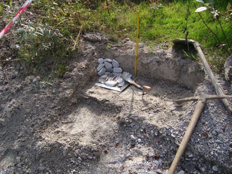 In diesem Fall leitete Dr. Arkadasch persönlich die Feinarbeiten zur Freilegung der Artefakte und beschied die anwesenden Grabungsmitarbeiter vom uferseitigen Feldweg aus auf die Fundstelle am südseitigen Furteingang Einsicht zu nehmen. Mit feinhaarigen Pinseln und Spachteln wurde die Fundstelle so weit freigelegt, dass eine erste kartographische Erfassung und Vermessung stattfinden konnte. Im Anschluss daran wurde die Fundstelle schichtweise freigelegt und unter grösster Vorsicht die drei dort liegenden Artefakte von Sand, Kieseln und Erde befreit.